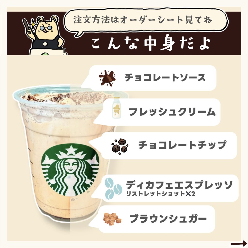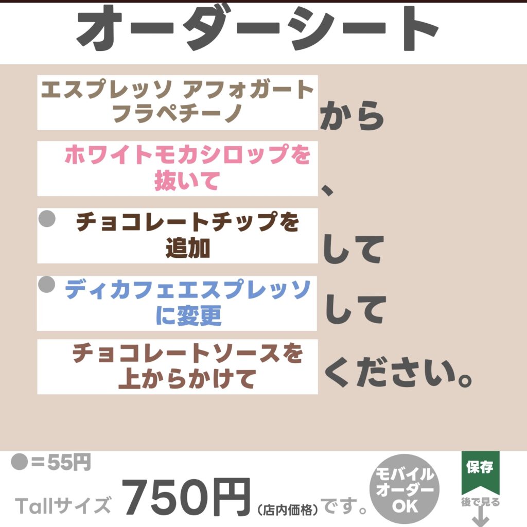 エスプレッソアフォガートフラペチーノからホワイトモカシロップを抜いてディカフェエスプレッソに変更してチョコレートチップを追加してチョコレートソースを上からかけてください