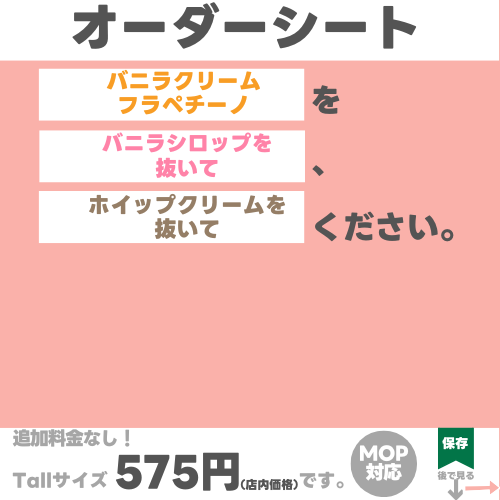 バニラクリームフラペチーノバニラシロップを抜いてホイップクリームを抜いてください