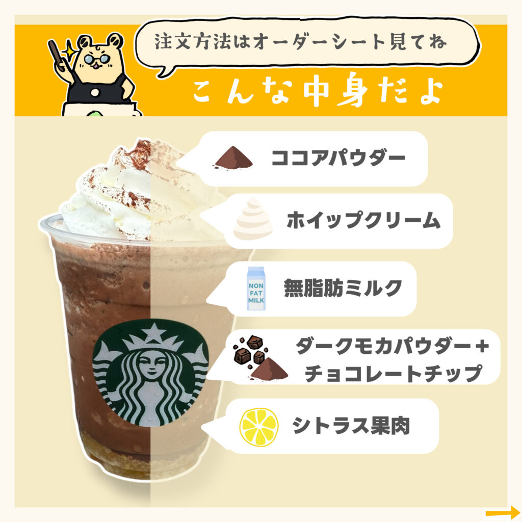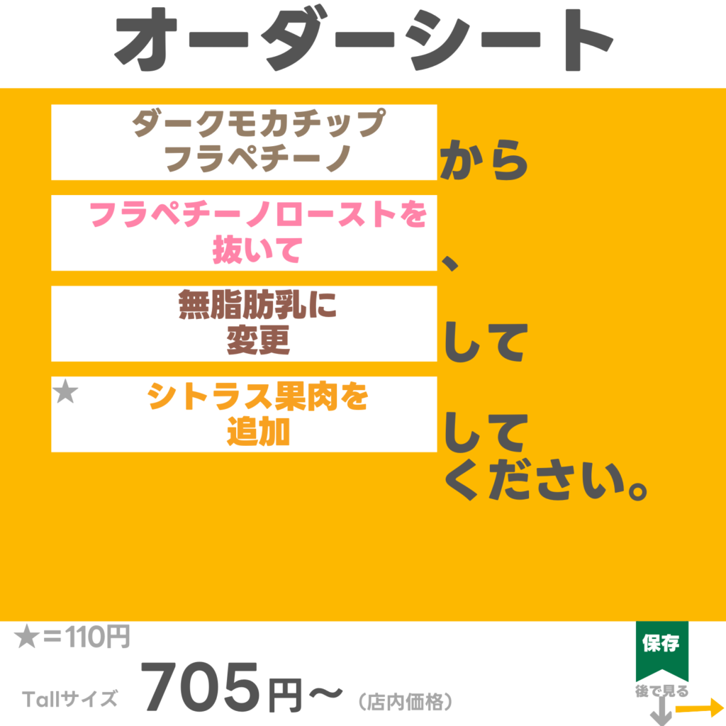 ダークモカチップフラペチーノからフラペチーノローストを抜いて無脂肪乳に変更してシトラス果肉を追加してください
