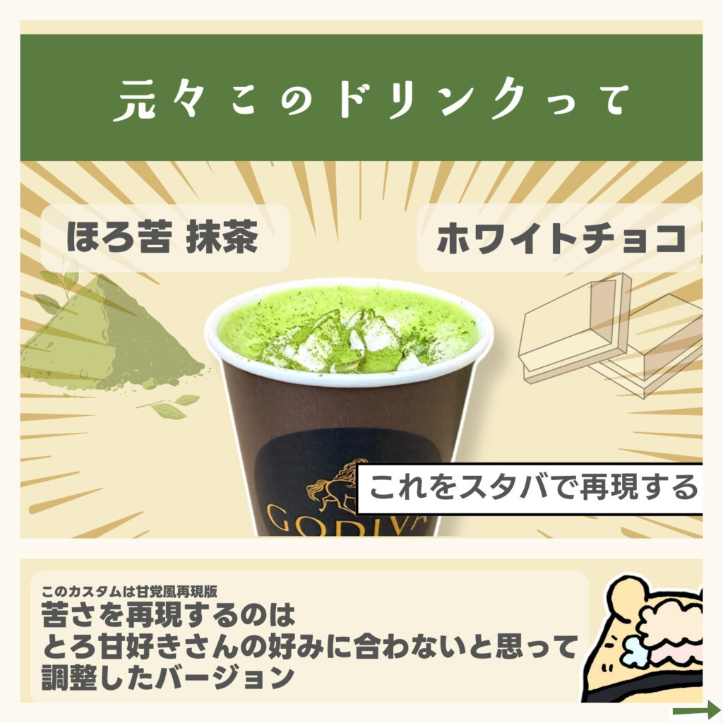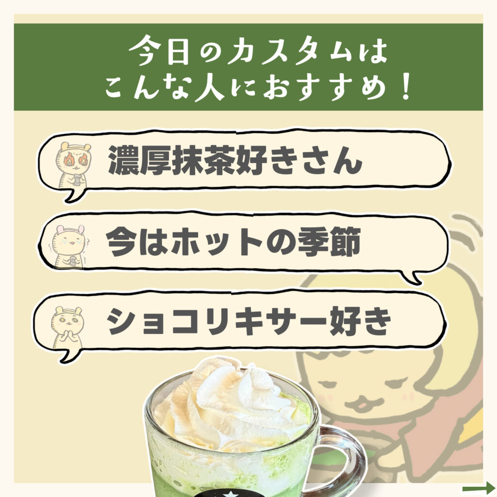 クリーミーな抹茶だけど、もしほろ苦な味が好きな人はこのカスタムに「ブロンドエスプレッソをリストレットで追加」してね