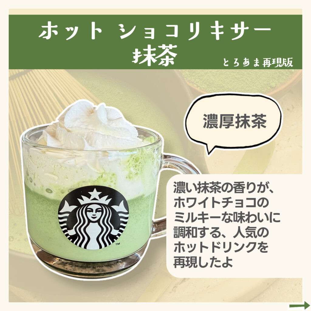 濃い抹茶の香りが、ホワイトチョコのミルキーな味わいに調和する、人気のホットドリンクを再現しました!!